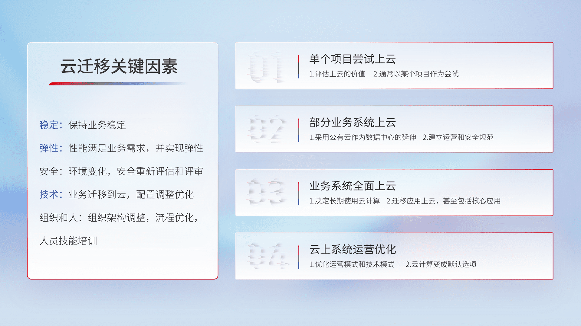 结合实际业务,,,从规划设计、、、、云平台选型、、、、云原生改造、、、数据迁移、、集成交付,,,,迁移全过程为客户识别最佳上云路径,,,,做好风险识别管理,,,,设计网络架构、、、、身份权限、、安全审计合规、、、操作审计、、、日志审计、、、、监控告警策略、、、、多站点容灾设计等,,对云上基础设施进行整体规划,,提升IT治理水平,,以满足弹性、、、高可用、、、、高性能的需求。。。。