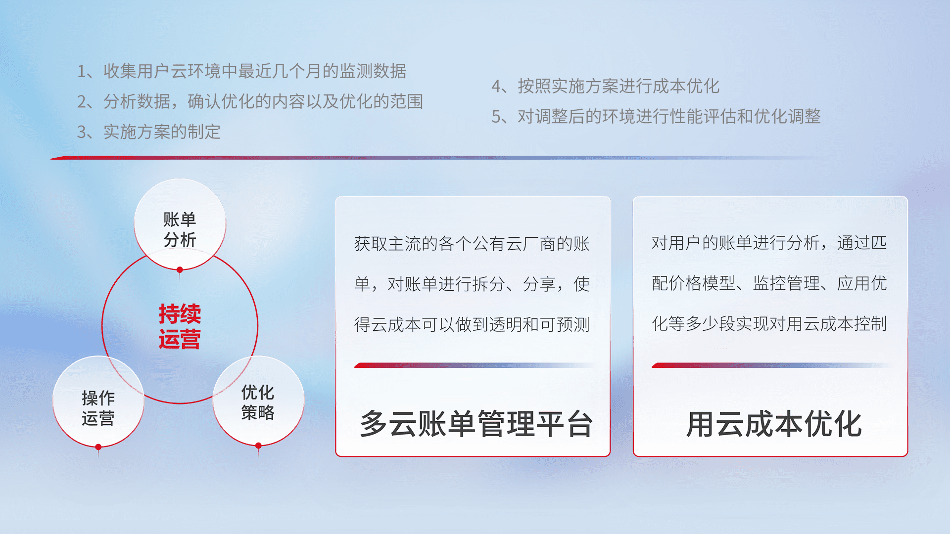 通过多云纳管,,,,以统一的资源数据模型把客户的云资源进行抽象和封装,,,,进而实现对多云资源的统一操作,,保障云资源管理的可靠性、、、、稳定性与可用性。。量身定制化运维内容,,配置、、、、开发运维、、、、补丁管理、、、备份、、、、监控、、、认证和访问管理、、审计和日常巡检等,,,保障在用云过程中的可靠度,,稳定度以及高可用率。。。。